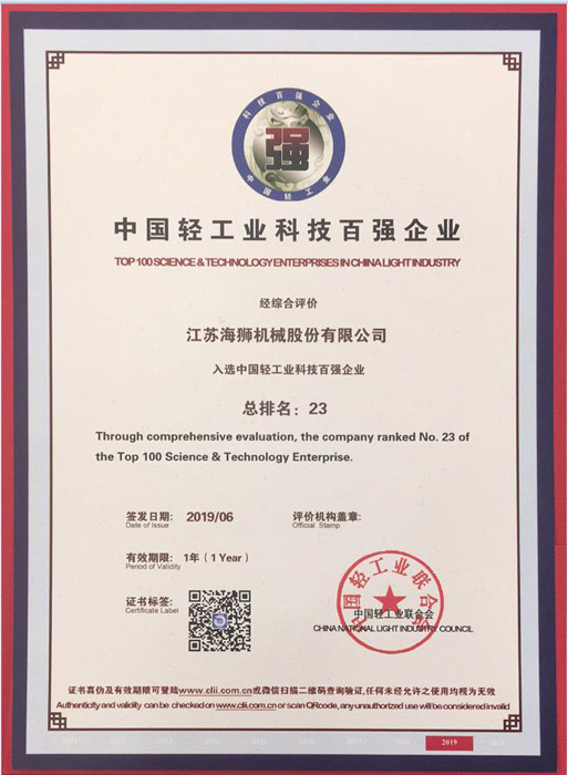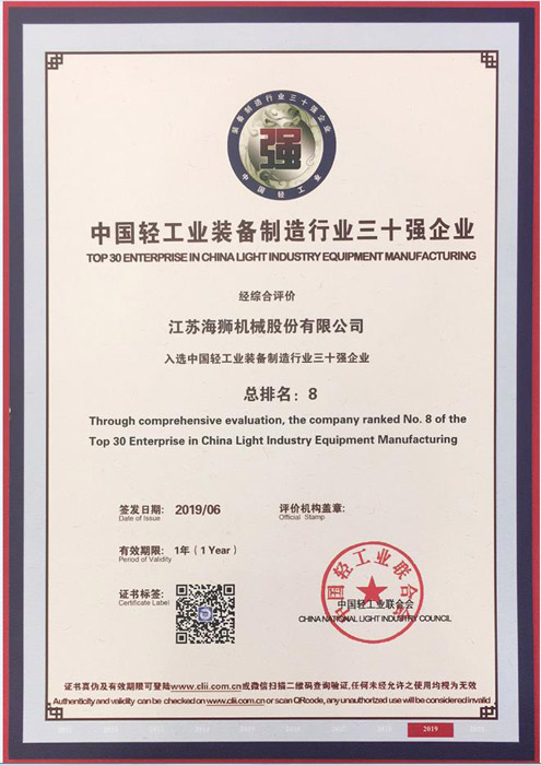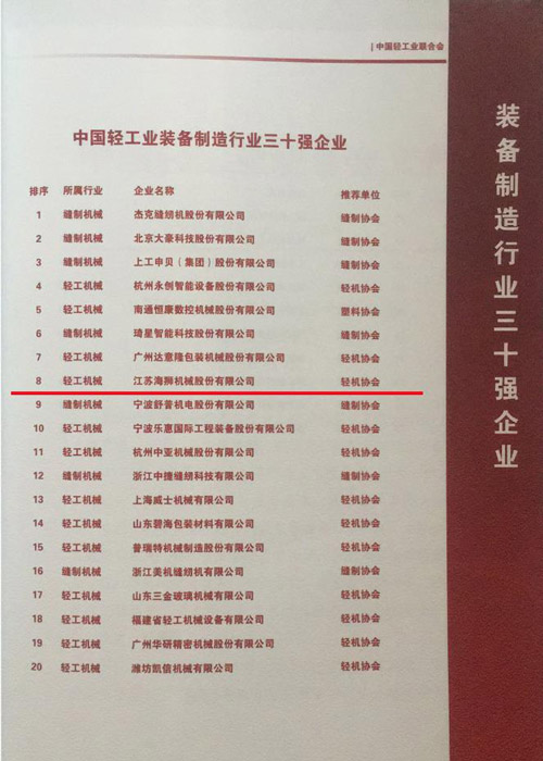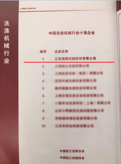 今日江蘇海獅機(jī)械股份有限公司榮獲了中國洗滌機(jī)械行業(yè)十強(qiáng)首位,中國輕工業(yè)裝備制造行業(yè)三十強(qiáng)企業(yè)第8位,中國輕工業(yè)科技百強(qiáng)企業(yè)第23位