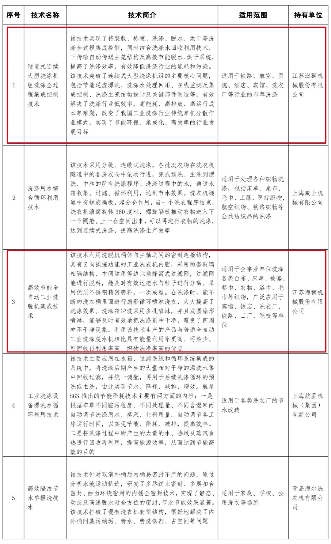 2020年11月16日,水利部、國(guó)家機(jī)關(guān)事務(wù)管理局關(guān)于公布國(guó)家成熟適用節(jié)水技術(shù)推廣目錄(2020年)的公告正式發(fā)布,為貫徹節(jié)水優(yōu)先方針,落實(shí)《國(guó)家節(jié)水行動(dòng)方案》目標(biāo)任務(wù),強(qiáng)化節(jié)水科技創(chuàng)新引領(lǐng),促進(jìn)水資源節(jié)約集約利用,水利部、國(guó)家機(jī)關(guān)事務(wù)管理局共同征集了洗滌設(shè)備、衛(wèi)生潔具、中央空調(diào)等領(lǐng)域的節(jié)水技術(shù)。經(jīng)專家評(píng)審、網(wǎng)絡(luò)公示,最后洗滌設(shè)備領(lǐng)域有4家企業(yè)5項(xiàng)成熟技術(shù)被收錄到《國(guó)家成熟適用節(jié)水技術(shù)推廣目錄(2020年)》中。江蘇海獅機(jī)械股份有限公司的隧道式連續(xù)大型洗滌機(jī)組洗滌全過(guò)程集成控制技術(shù)和高效節(jié)能全自動(dòng)工業(yè)洗脫機(jī)集成技術(shù)被收錄到國(guó)家成熟適用節(jié)水技術(shù)推廣目錄之中。
